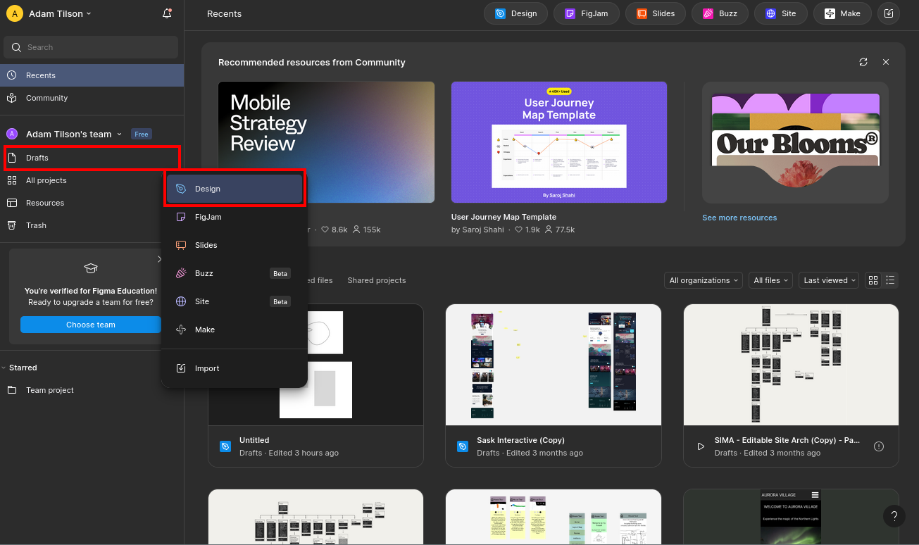 Note: Figma’s free edition allows for Unlimited drafts, but a limit on files which you can collaborate on. Getting verified for education will increase this limit. If you plan to use this primarily for you own projects, and do not plan to collaborate, free is fine, just make sure you save everything in drafts!